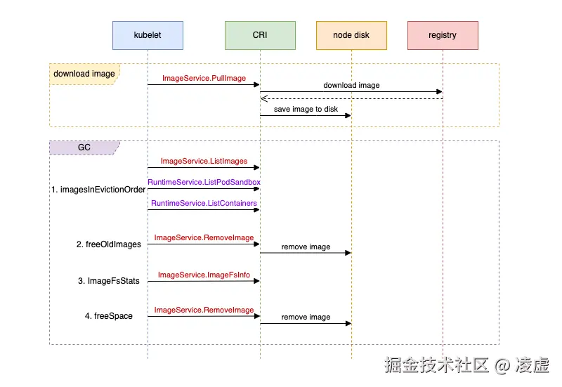 在 node 节点上,镜像由 CRI 组件(如 containerd、cri-o)管理。kubelet 每 5 分钟进行一次镜像的垃圾回收。如果配置了 imageMaximumGCAge 镜像的最大存在时间,则不管磁盘使用率是否达到高水位线,都会删除符合条件的镜像。之后,镜像的删除将依据 imageGCHighThresholdPercent、imageGCLowThresholdPercent 高低水位线的配置来触发,具体删除操作由 CRI 组件执行,而 kubelet 仅负责发起 gRPC 调用。