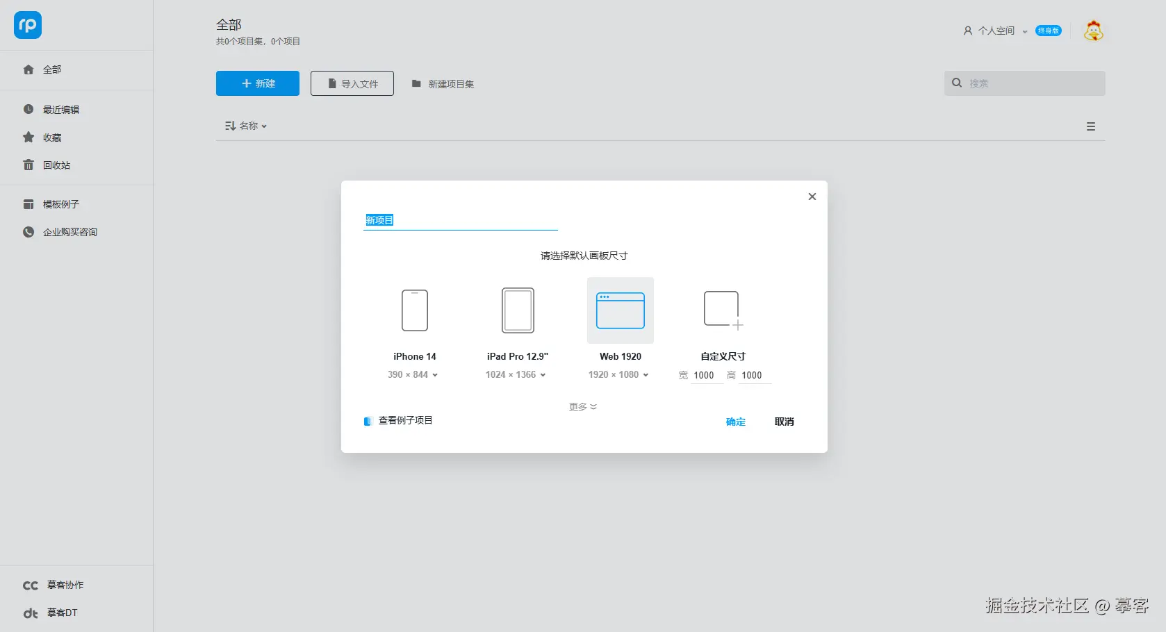注册并登陆摹客RP(www.mockplus.cn/rp),点击使用,新建原型项目,选择Web原型,填写项目名。