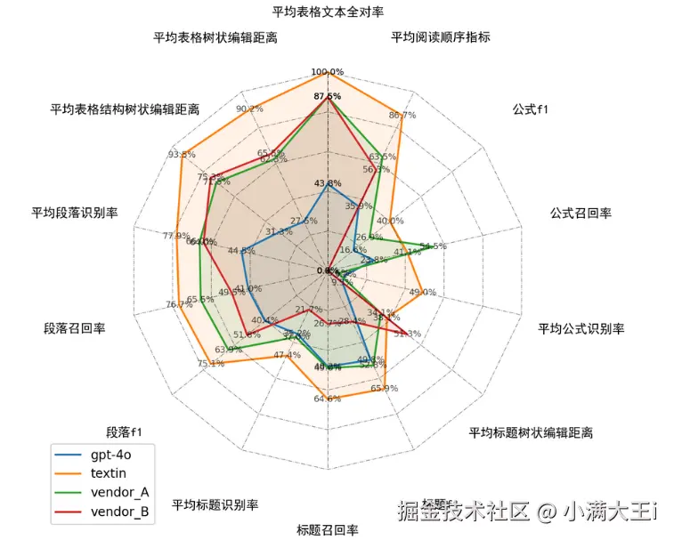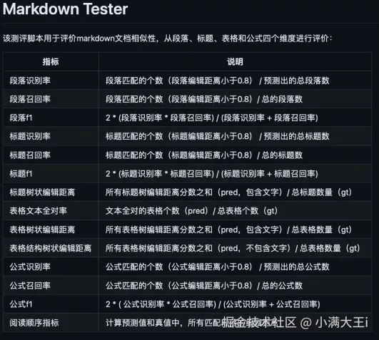 合合信息推出的文档解析测评工具(markdowntester),能够针对表格、段落、标题、阅读顺序、公式进行定量测评,并提供了直观的雷达图。开发者可以根据最直观的测评数据结果,选择最合适的文档解析工具。markdowntester开源地址:github.com/intsig/mark…