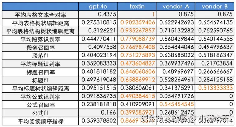 下面我们将gpt-4o、verdor_A、verdor_B和合合信息家的智能文档解析平台TextIn对表格数据解析效果进行对比,可以看到,在某些指标里,TextIn最为突出: