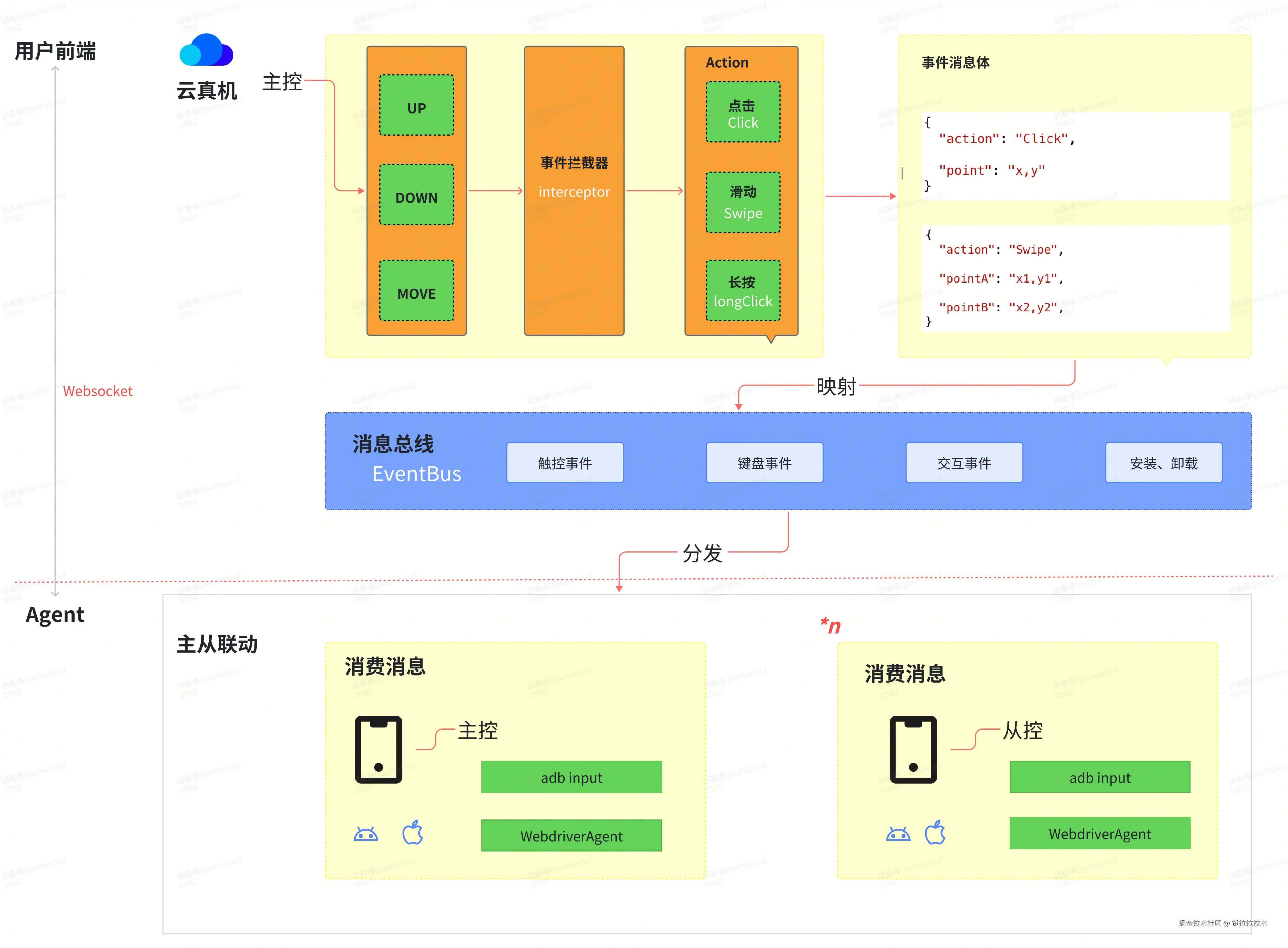 EventBus: EventBus是分配消息的一种实现机制,它拥有部署在Agent的手机建立的websokect长连接的管理及操控权限。消息则是通过EventBus的发送到Agent的端,最后由Agent注入到手机执行消费。