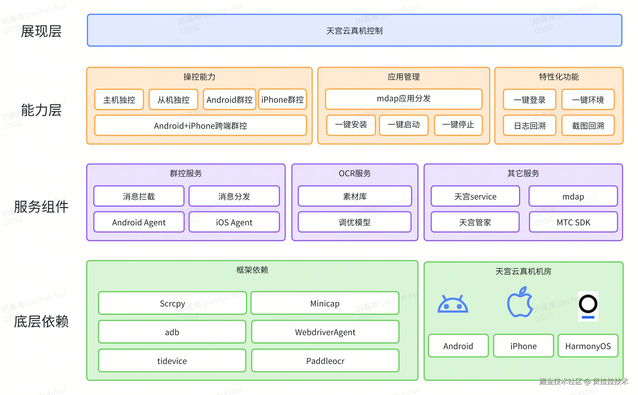 至于云真机的部署、通信、投屏等详细方案,感兴趣的同学可以查看之前的文章,这里是详细介绍多机同步的的实践,整体技术架构如图: