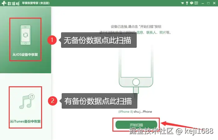 步骤1:苹果手机通过数据线连接到电脑后,启动苹果恢复专家软件并根据实际情况选择合适的扫描方式(无备份扫描和有备份扫描),点击【开始扫描】。