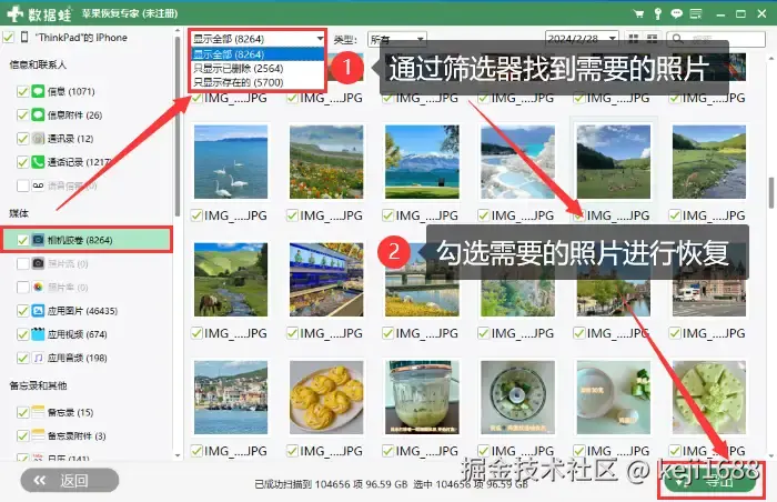 步骤3:扫描结束后,可通过筛选器快速找到需要恢复的照片,勾选需要的照片进行恢复并导出到电脑上。
