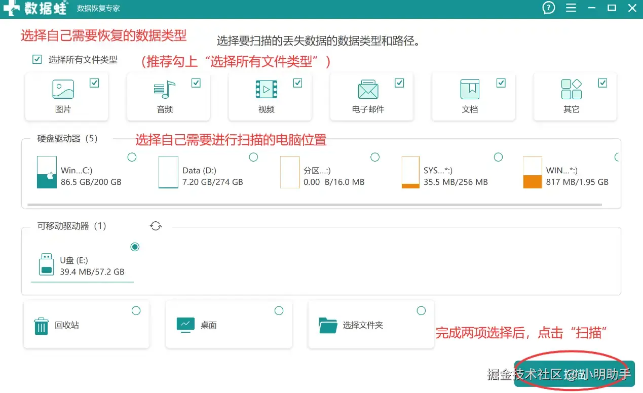 步骤1: 点开数据 蛙恢复专家这款软件,在软件的首页选择需要恢复的数据类型和需要扫描的具体硬盘,用户还可以直接选择桌面、回收站、甚至某一文件夹进行扫描,最后点“扫描” 。