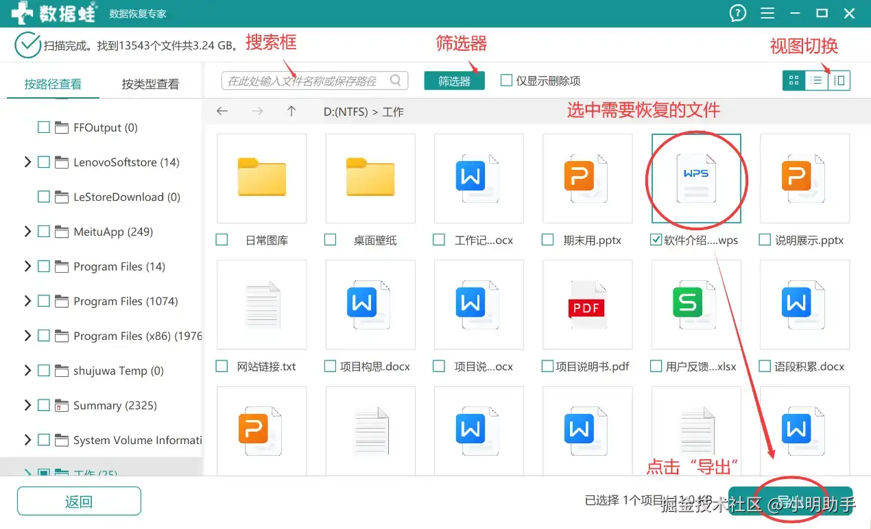 步骤2: 耐心等待软件完成扫描后,用户可以在页面上方选择“搜索框”、“筛选器”、“切换视图”等工具,协助自己提高效率找回需要恢复的数据。选中文件后,点击右下角的“导出”。