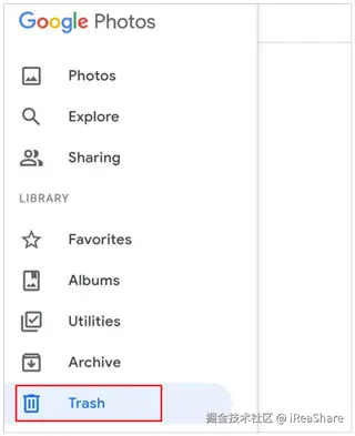 步骤3: 点击左上角的“菜单”,然后选择“垃圾箱”。然后从 Google 相册中永久删除已删除的照片。现在,您无法再恢复照片。