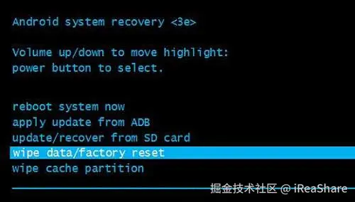 步骤3: 使用音量键选择“擦除数据/恢复出厂设置”,然后单击“电源”确认。然后选择“恢复出厂设置”并点击“电源”再次确认。然后它将开始重置您的 Android 手机。如果提示您使用 Google 帐户凭据进行验证,请正确输入信息。