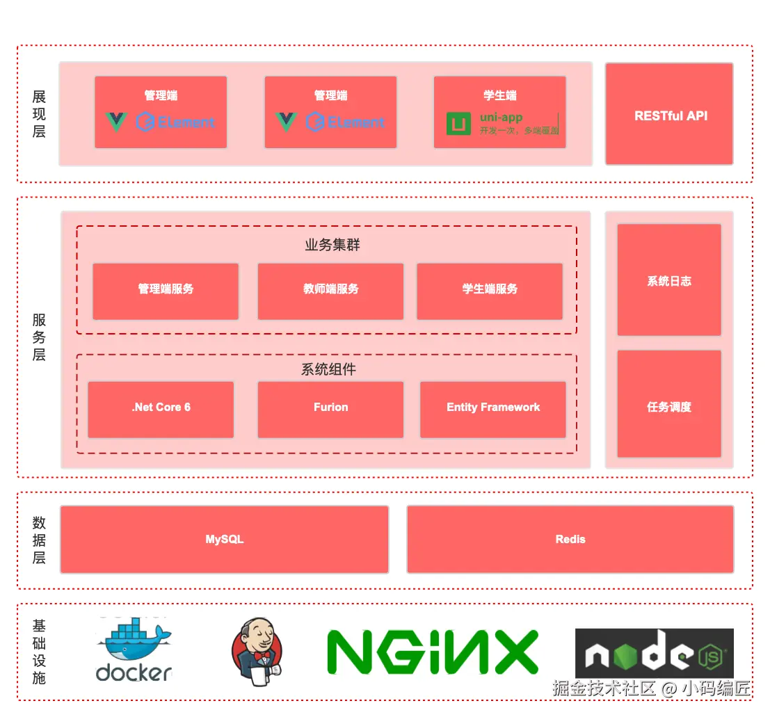 基于 .NET 6、Vue 和 ElementUI 等技术的在线考试系统的整体架构,具体如下图所示: