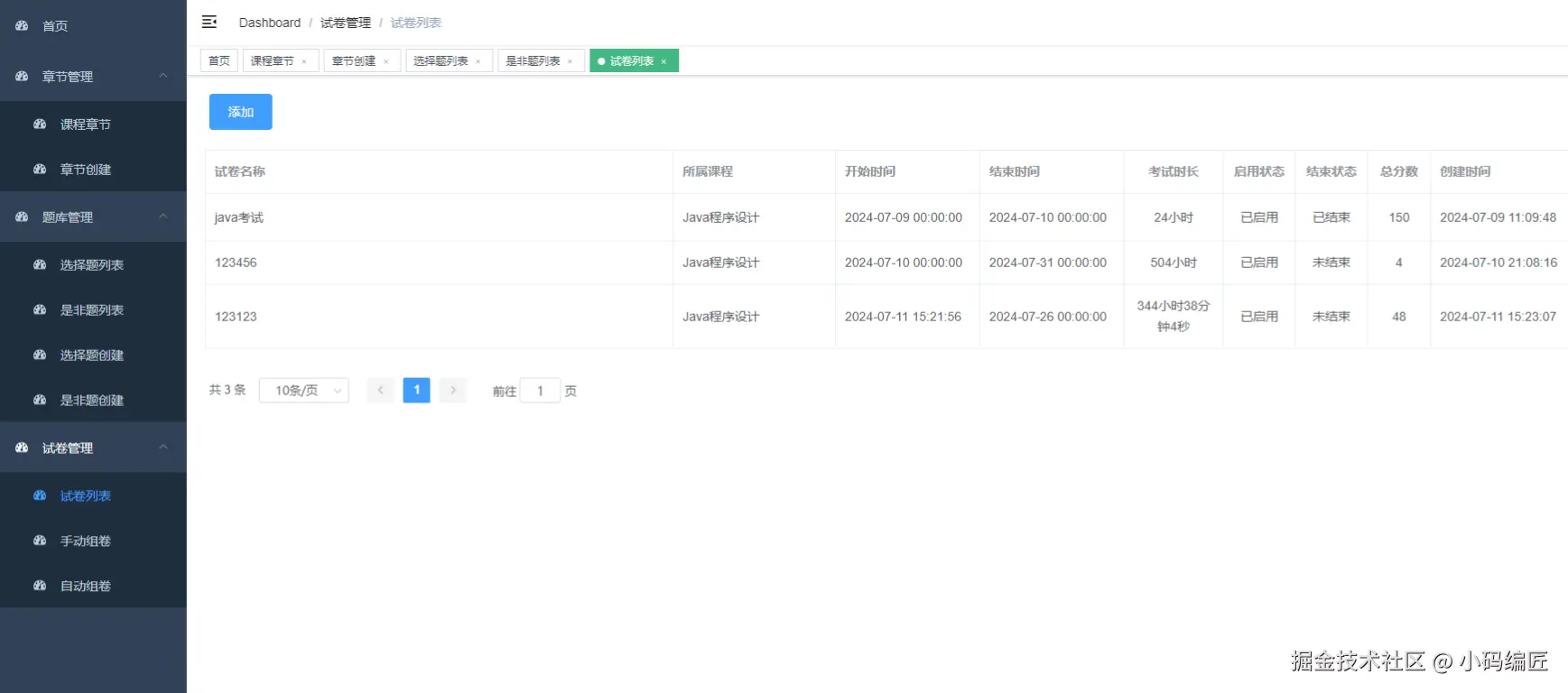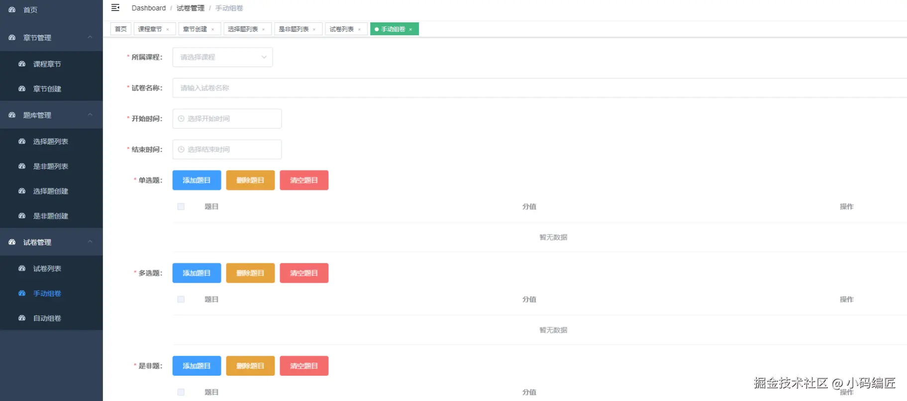 | 组卷管理 | 手动组卷:根据需要指定需要的题目创建试卷; 自动组卷:根据配置自动组合试卷,效率更高。 |