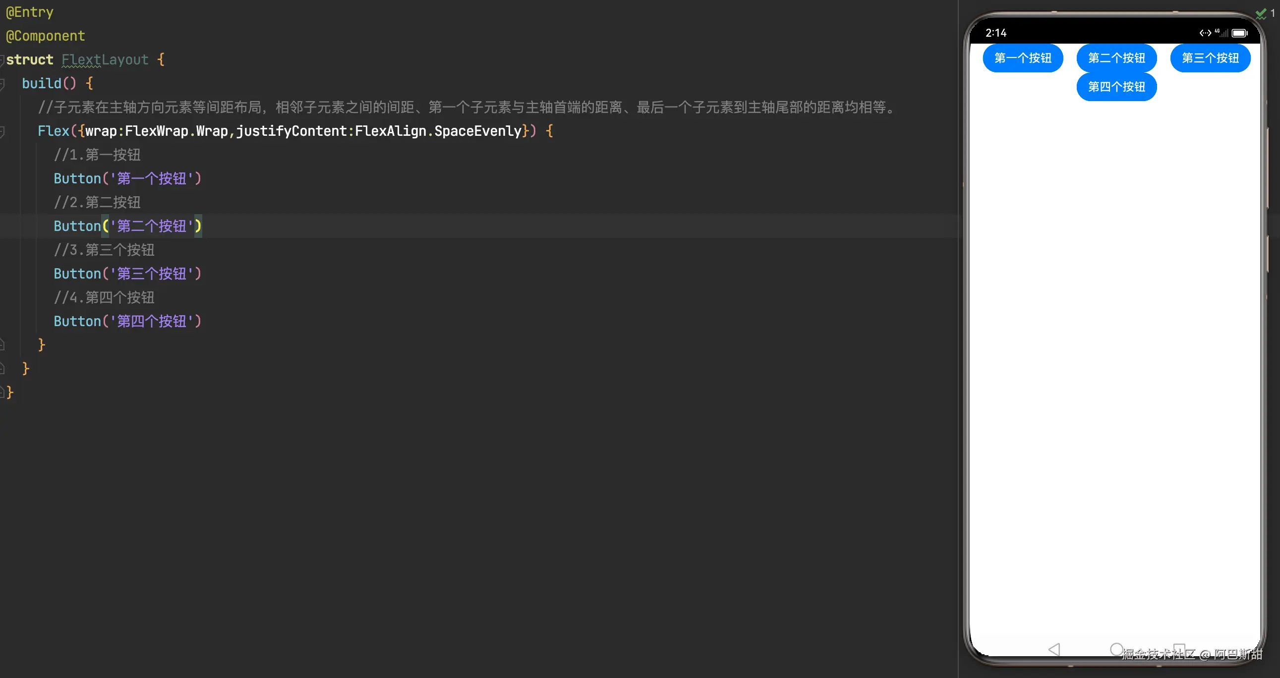 - FlexAlign.SpaceEvenly: 子元素各行间距、子元素首尾行与交叉轴两端距离都相等。