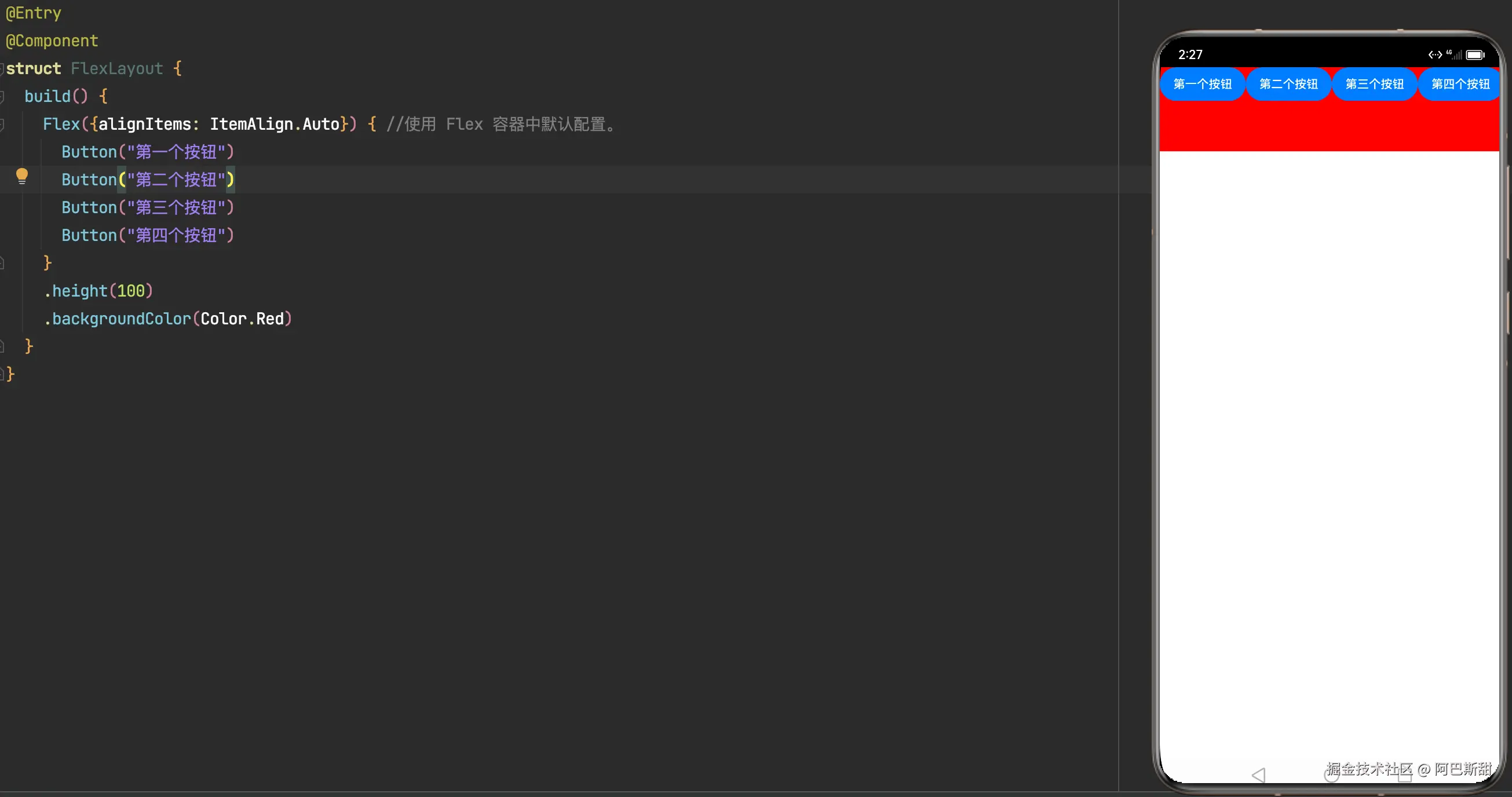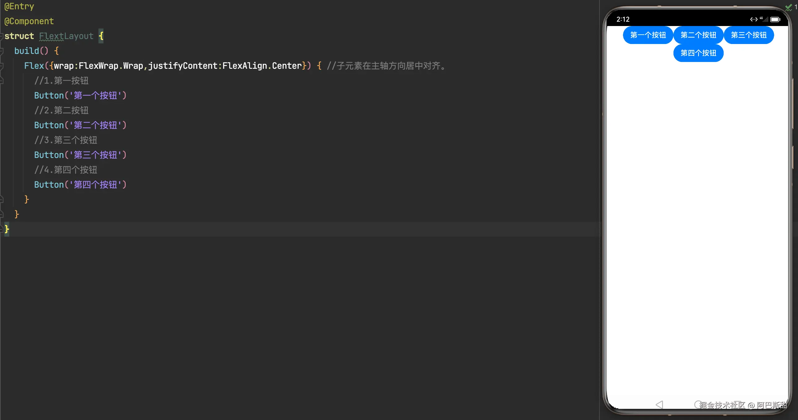 Flex({direction:FlexDirection.Row}){ //主轴为水平方向,从左到右排布(默认值)