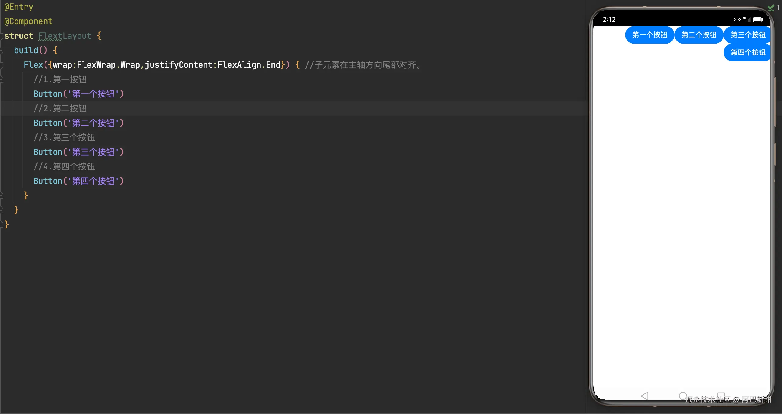 - FlexAlign.End:子元素各行与交叉轴终点对齐。