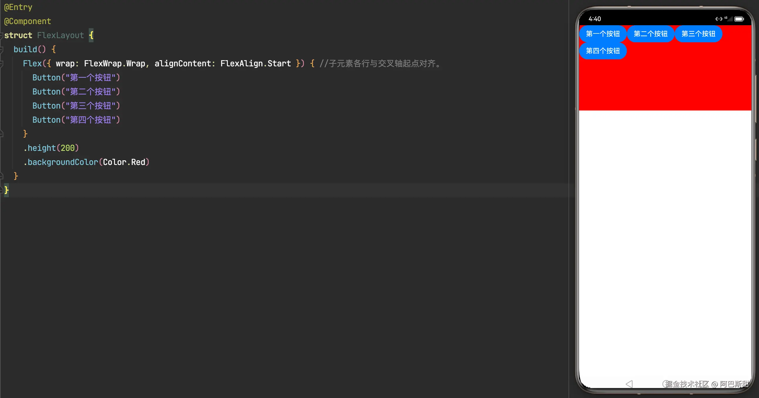 Flex容器组件通过 alignContent 参数设置子元素各行在交叉轴剩余空间内的对齐方式,只在多行的 Flex 布局中生效。