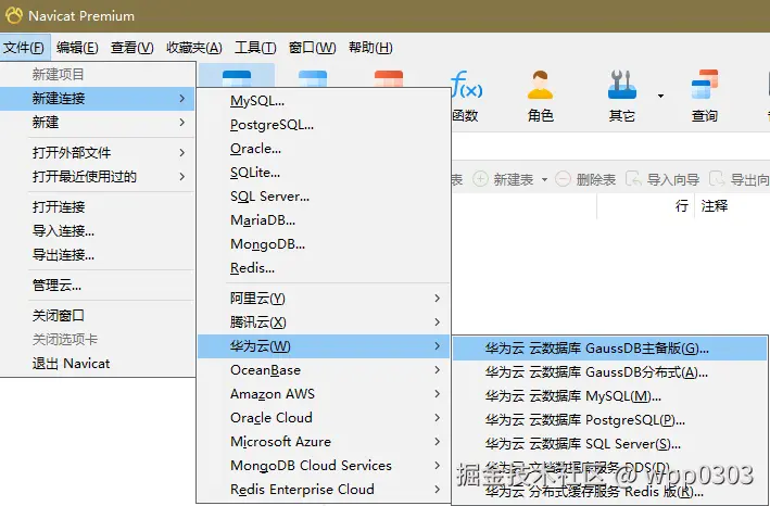 打开Navicat Premium,单击文件 > 新建连接 > 华为云 > 华为云 云数据库 GaussDB主备版/华为云 云数据库 GaussDB分布式。