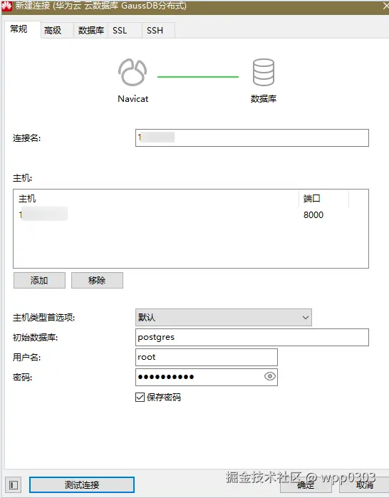 如果未绑定弹性公网IP,则需要为数据库实例绑定弹性公网IP。具体操作请参考绑定弹性公网IP。 | | 端口 | 需要连接的数据库端口。创建实例时自定义的端口,GaussDB实例的默认端口为8000。 | | 初始数据库 | 需要连接的数据库名。实例创建成功后,会默认生成名称为postgres的数据库。 | | 用户名 | 需要访问GaussDB实例的账号名称。默认root。 | | 密码 | 要访问GaussDB实例的账号所对应的密码。 |