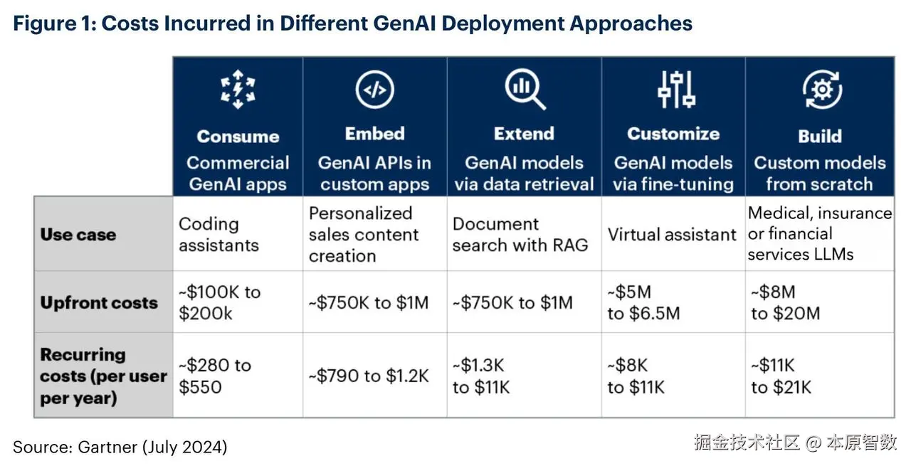 项目高昂的部署成本是企业面临的主要挑战之一。根据Gartner的分析,面向低端规模企业的生成式AI API初期成本在10万到20万美元之间,此外还有每位用户每年550美元的维护费用。对于高端规模,定制化模型的微调或从零开始部署的初期投资在500万到2000万美元之间,每位用户的年费用在8000到21000美元不等。