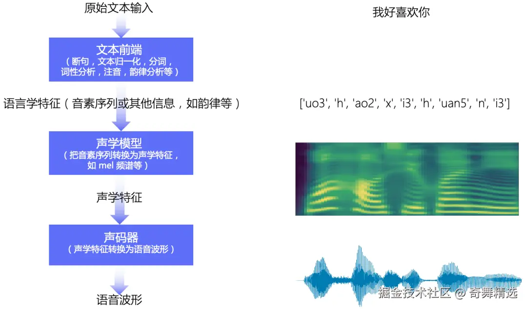 通过文本前端模块将原始文本转换为字符/音素;通过声学模型将字符/音素转换为声学特征,如线性频谱图、mel 频谱图、LPC 特征等;通过声码器将声学特征转换为波形。