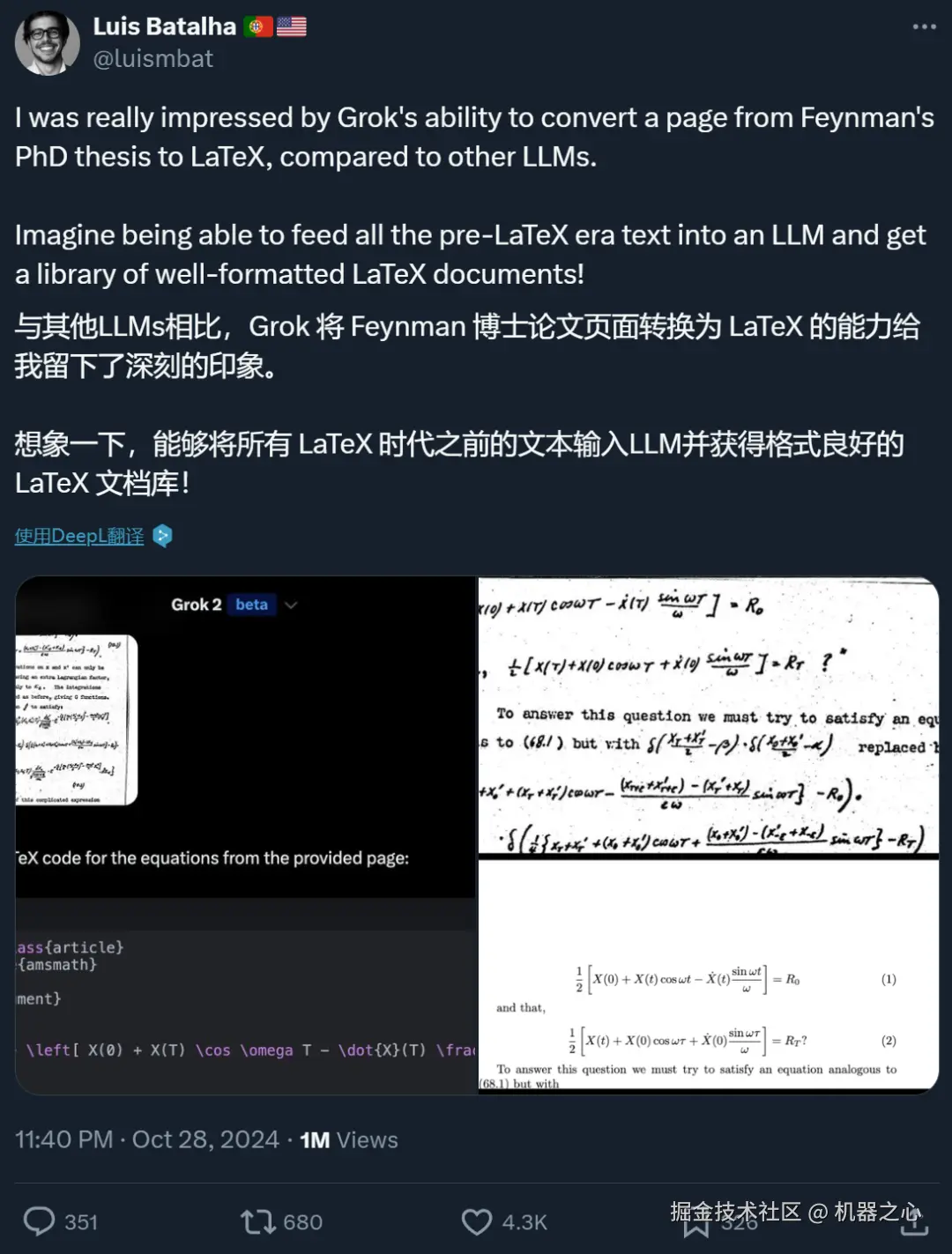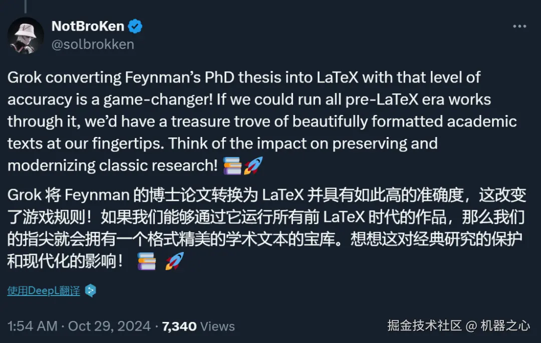 AI 销售和营销自动化平台 Amplemarket 创始人 Luis Batalha 在试用后表示:借助 Grok,他能把理论物理学家 Feynman 博士论文中的公式转换成 LaTeX。