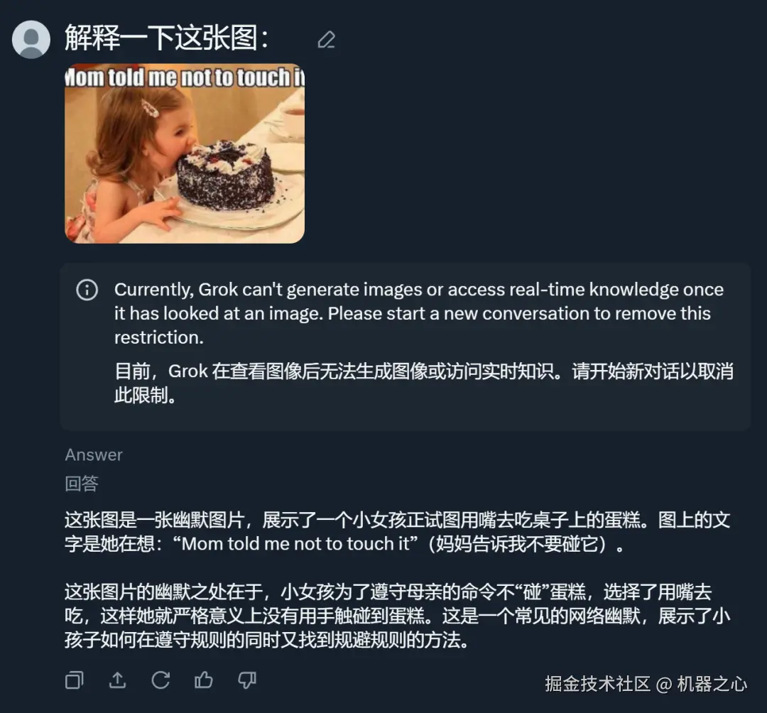 不知大家是否 get 到小女孩吃蛋糕这张图的笑点。如果没有,当你看完 Grok 的解释,有种恍然大悟的感觉。