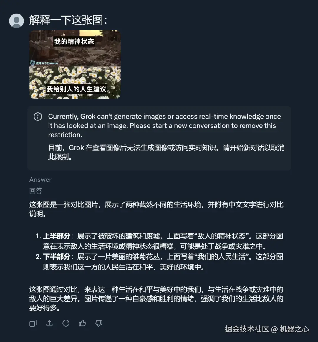 经过测试,我们还发现 Grok 对图片中的中文理解的不是很好,比如错把中文字符「我的精神状态」转换成「敌人的精神状态」。