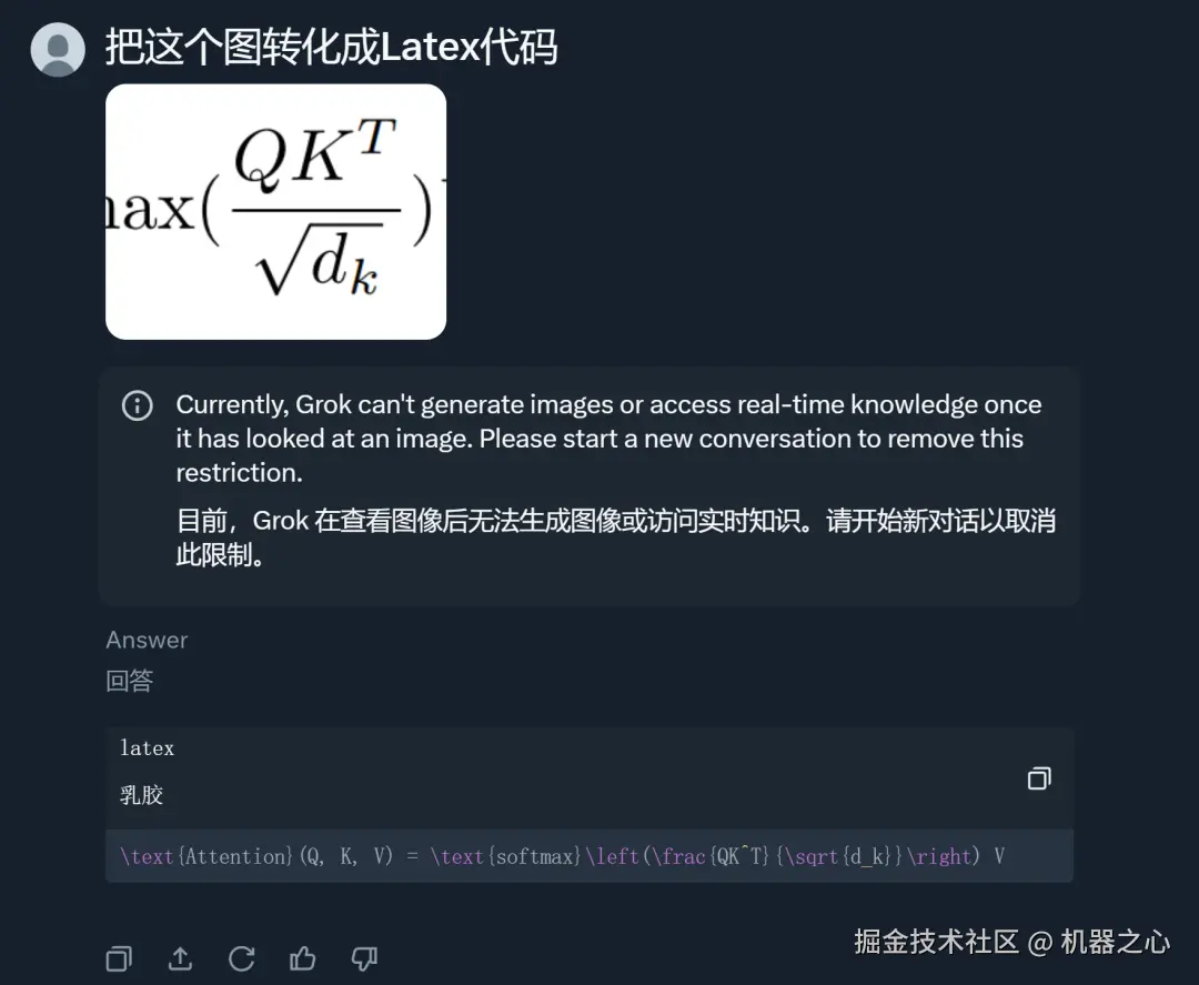 首先,机器之心测试了一下 Grok 对公式的处理能力。我们输入经典论文《 Attention Is All You Need 》中的一张公式截图,要求转换成 LaTeX 代码。