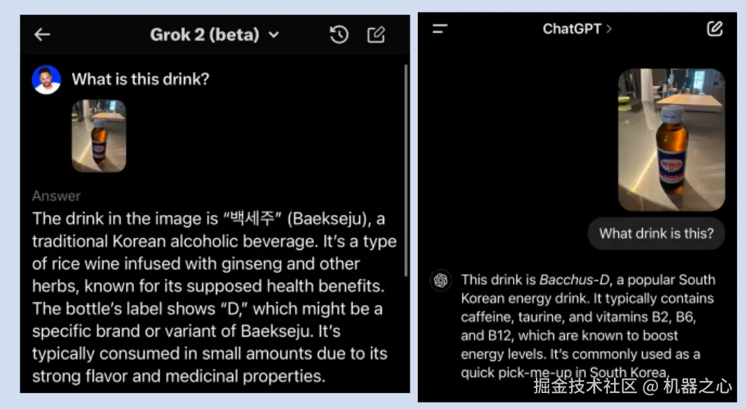 还有网友上传了一张饮料图片,让 Grok 和 ChatGPT 进行回答。从上传的资料来看,图片内容并不清晰,而且还不是中文,对于不懂外语的小伙伴可能有点难度。但是 Grok 和 ChatGPT 都给出了回答。