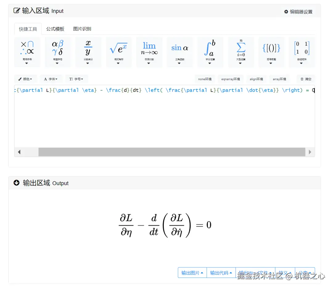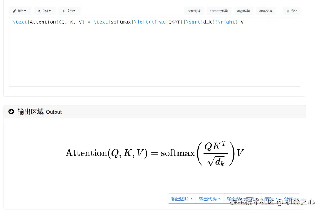 然后,我们将 LaTeX 表达式输入到在线 LaTeX 公式编辑器中进行转换,比对之后发现结果完全正确。