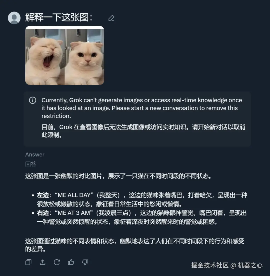 不过,Grok 并不是总懂幽默。我们输入如下图片,图片原来的意思应该是想表达打工人的一天似乎都很疲惫,但到了深夜却格外精神。但 Grok 给出的结果并不是。