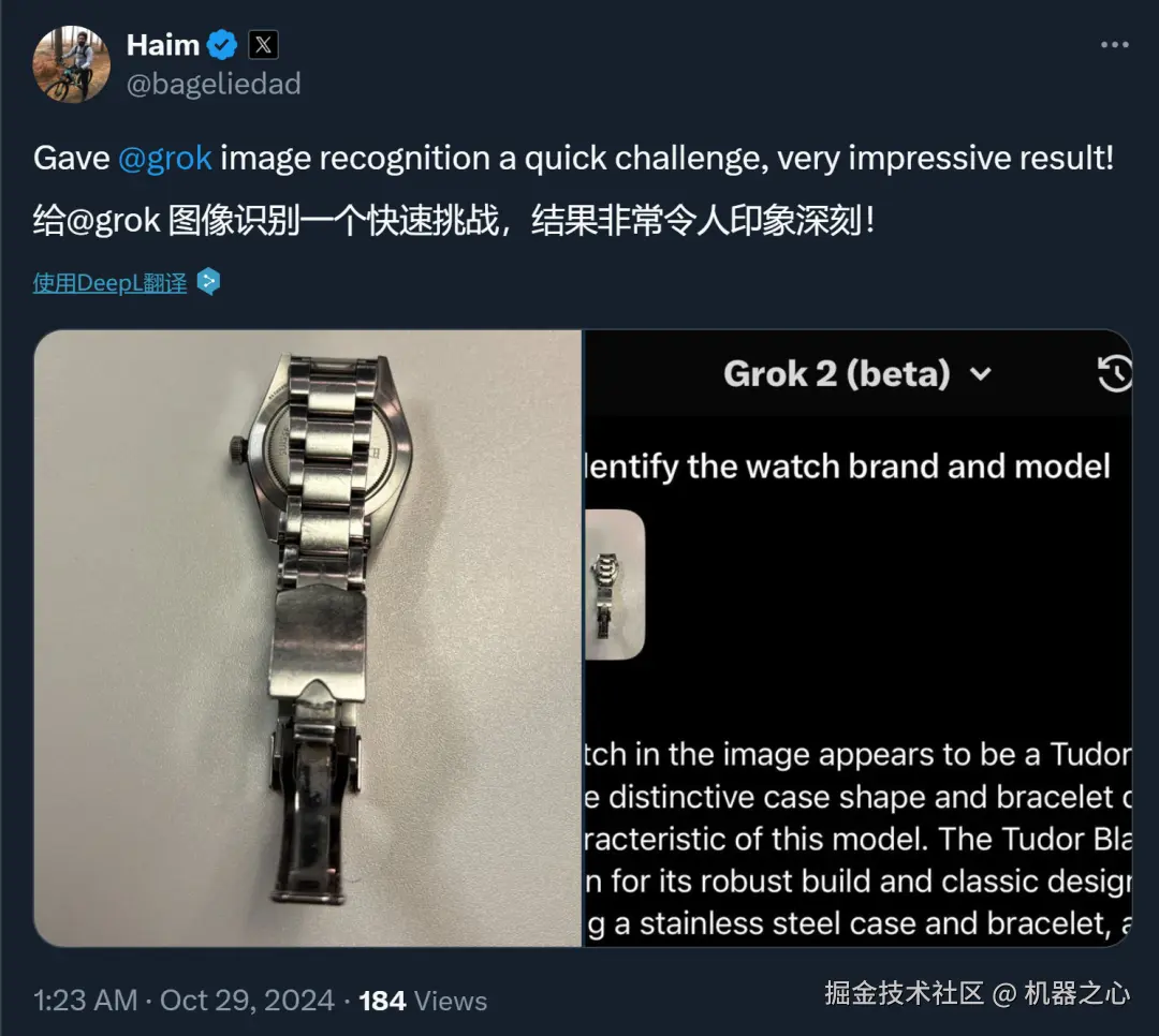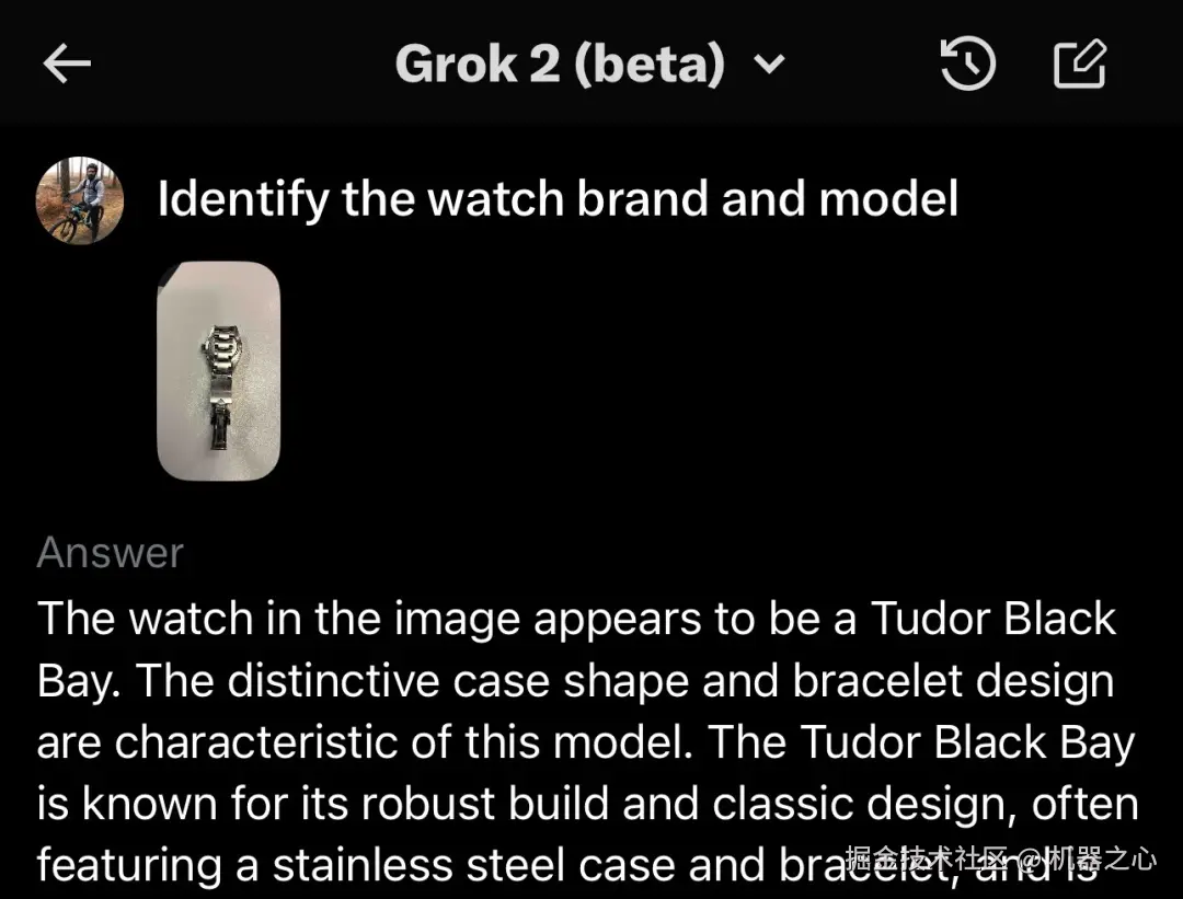 在识别其他图像方面,Grok 表现也非常不错。比如网友上传了一张手表的照片,Grok 根据表壳形状和表带设计猜出了表的品牌(对手表有研究的读者可以看下猜得对不对)。