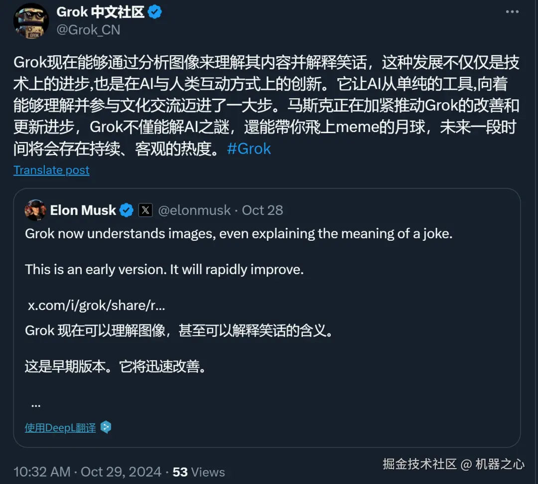 马斯克旗下的人工智能公司 xAI 发布的 Grok 大模型有助于实现这一目标 —— 在经历了最近的一次更新后,Grok 大模型终于能看懂图像了,甚至还能做公式 OCR、解释笑话。