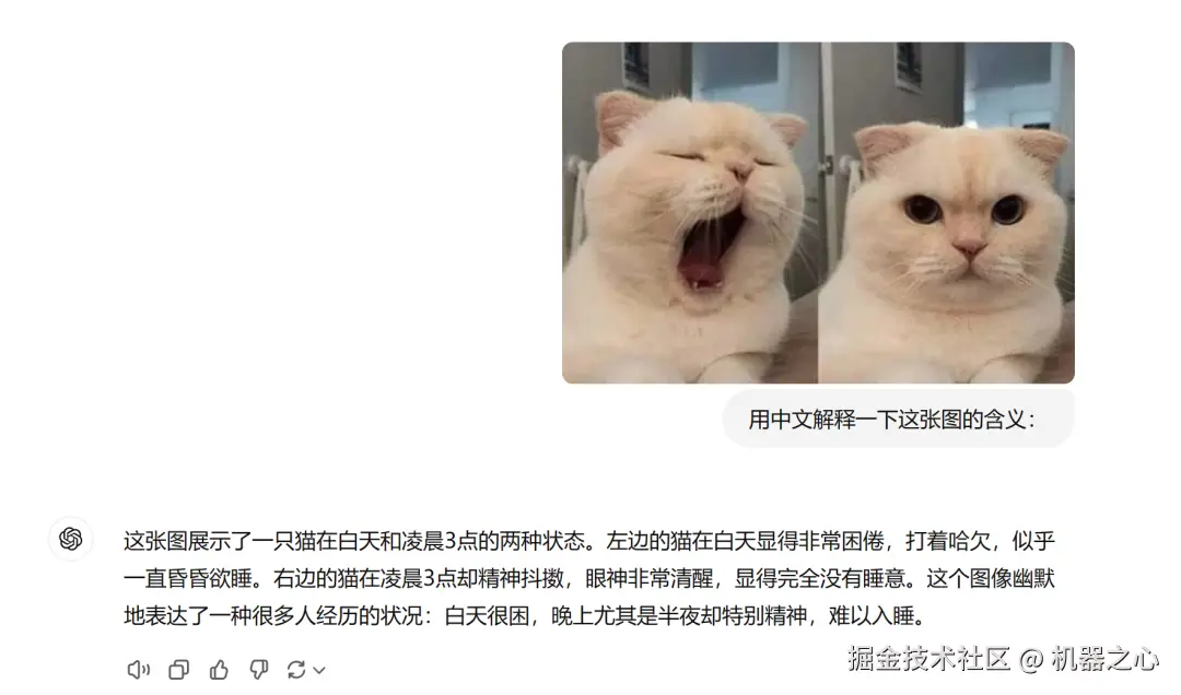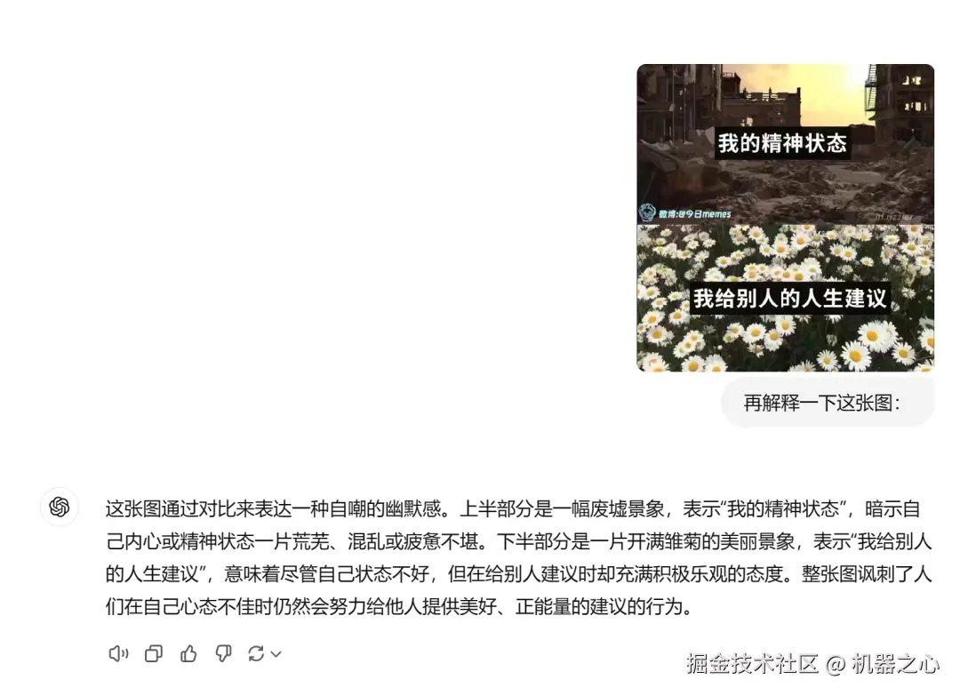 对于 Grok 没有理解的梗图,我们在 ChatGPT 上也做了测试。ChatGPT 的回答明显更胜一筹,中文识别能力也更强。