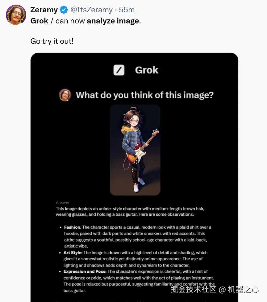 你还可以让 Grok 点评图片,它能从时尚、风格、表情等多个角度进行描述。比如针对下面这张图,Grok 回答:「图片中描述了一位动漫风格的人物,这位人物拥有中等长度的棕色头发,戴着眼镜,并且正在弹奏贝斯吉他。该角色展现了一种休闲、现代的造型,穿着一件格子衫外套和深色裤子,以及带有红色装饰的白色运动鞋。这种装扮表明这是一个年轻的、可能还在上学的角色,给人一种悠闲的艺术氛围……」