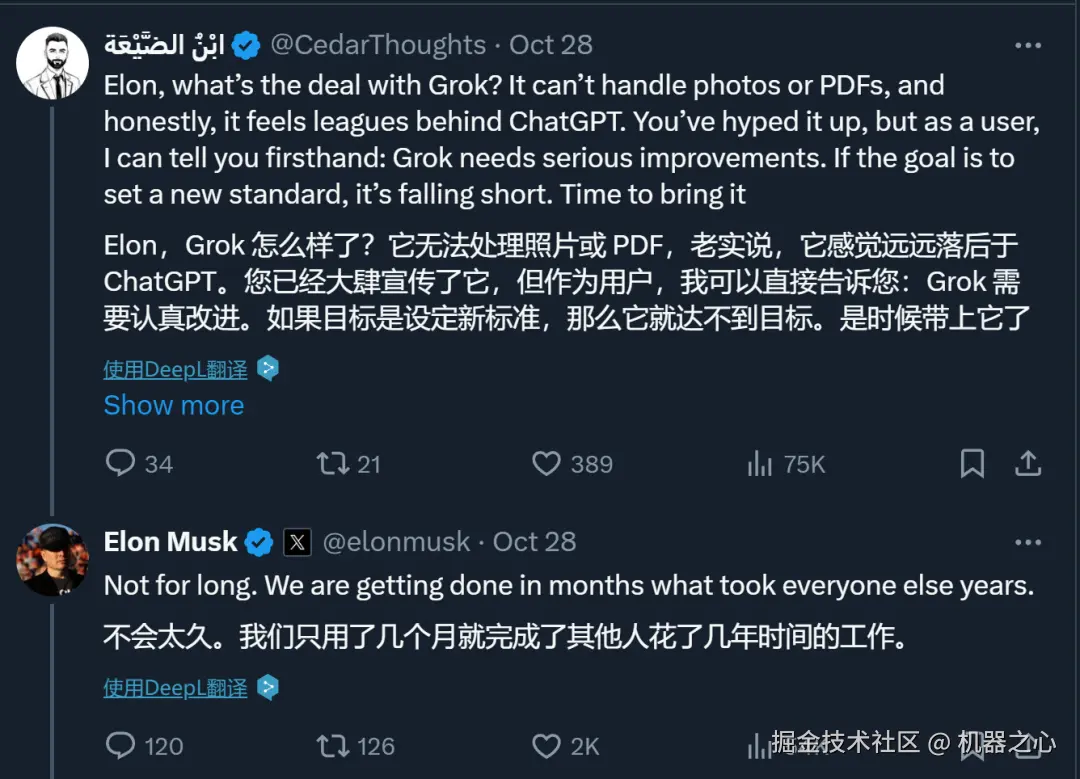 虽然识图是 Grok 的新功能,效果也很惊艳,但在众多 AI 模型中,这实在算不上一项新颖的功能。因此,有人在马斯克的评论区发出灵魂拷问,「Grok 到底进展到什么程度了?感觉远远落后于 ChatGPT 啊」。对此,马斯克耐心回复说,「我们只用了几个月就完成了其他人花了几年时间的工作。」言下之意似乎是不着急,慢慢打磨新功能。