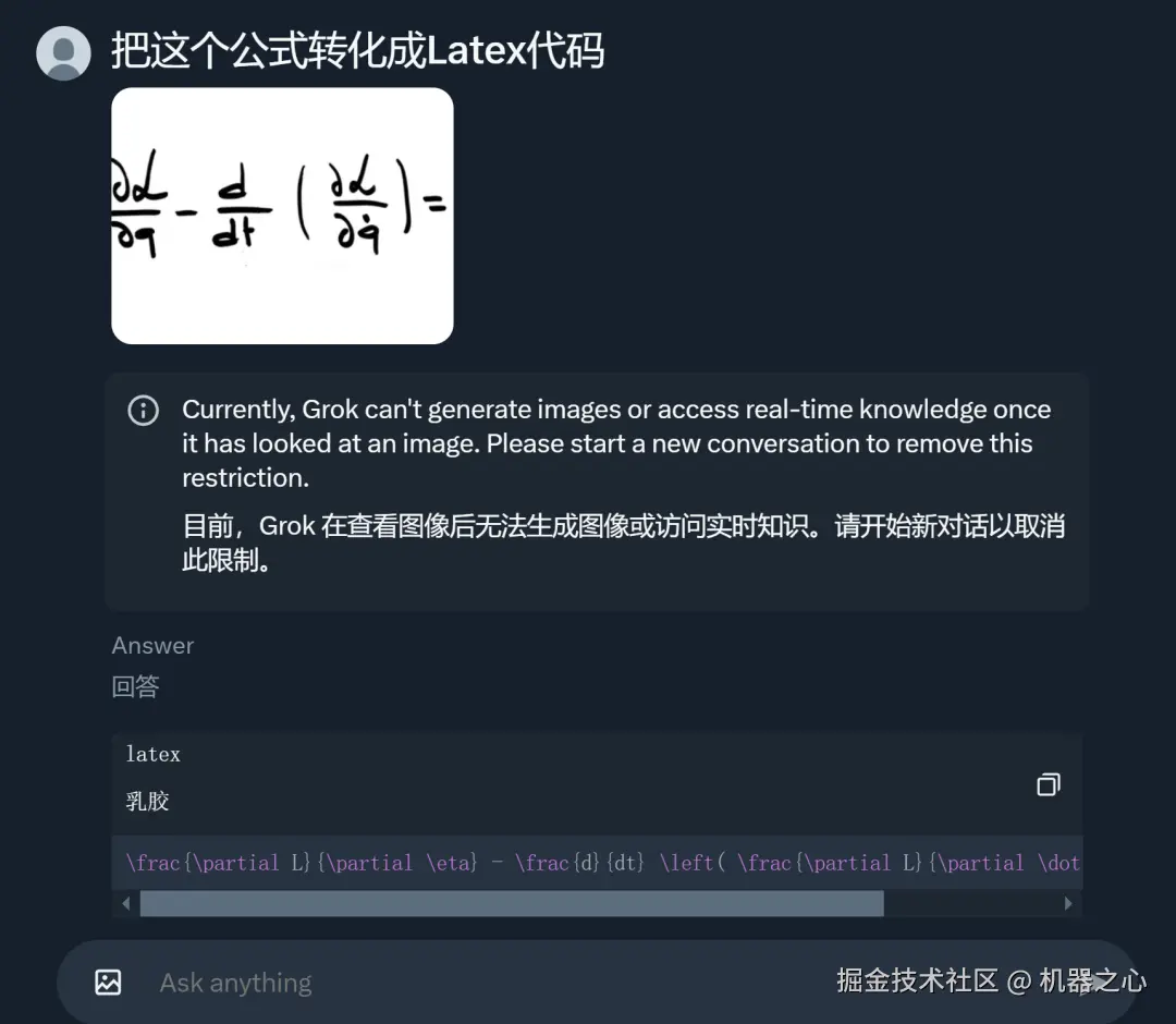 之后,我们上了点难度,用手写公式进行测试,输入的公式截图看起来不是很规范,但 Grok 还是给出了结果。