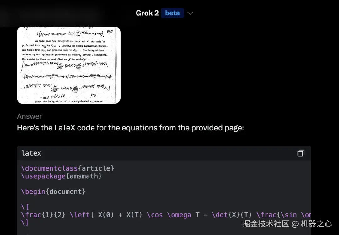 可以看出,里面的公式基本都是手写的,肉眼辨认尚有难度。而 Grok 可以把它们转化成如此工整的结果,而且准确率令人惊叹。