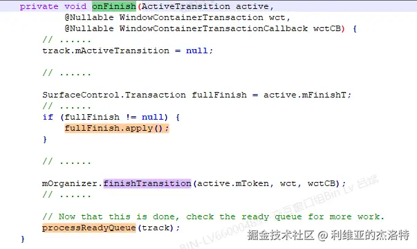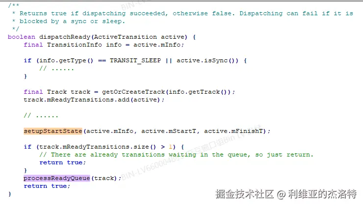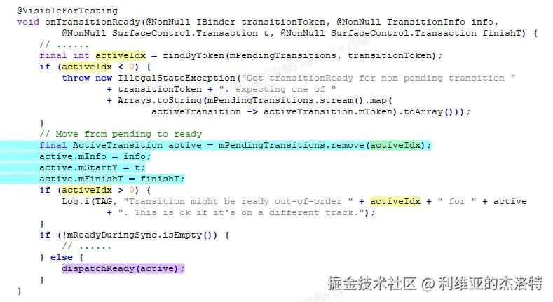 另外就如这里的注释所说,ActiveTransition发生了改变,“Move from pending to ready”,也就是说当ActiveTransition创建后就一直是pending的状态,当WMCore侧走到Transition.onTransactionReady,即Transition就绪的时候,再通知WMShell说WMCore这边就绪了,该你这边了,然后ActiveTransition就从等待状态切换到就绪状态(虽然没有一个状态值来表明ActiveTransition所处的状态)。