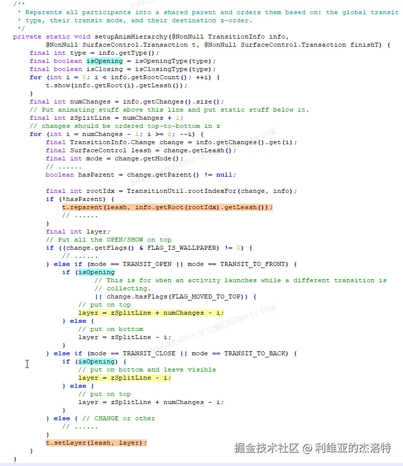 1)、Transitions.setupAnimHierarchy用来在动画开始前,将动画参与者reparent到共同的父Layer上,然后设置它们的Z轴层级。