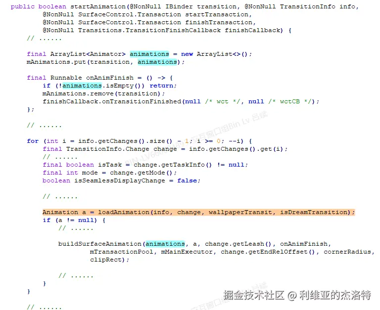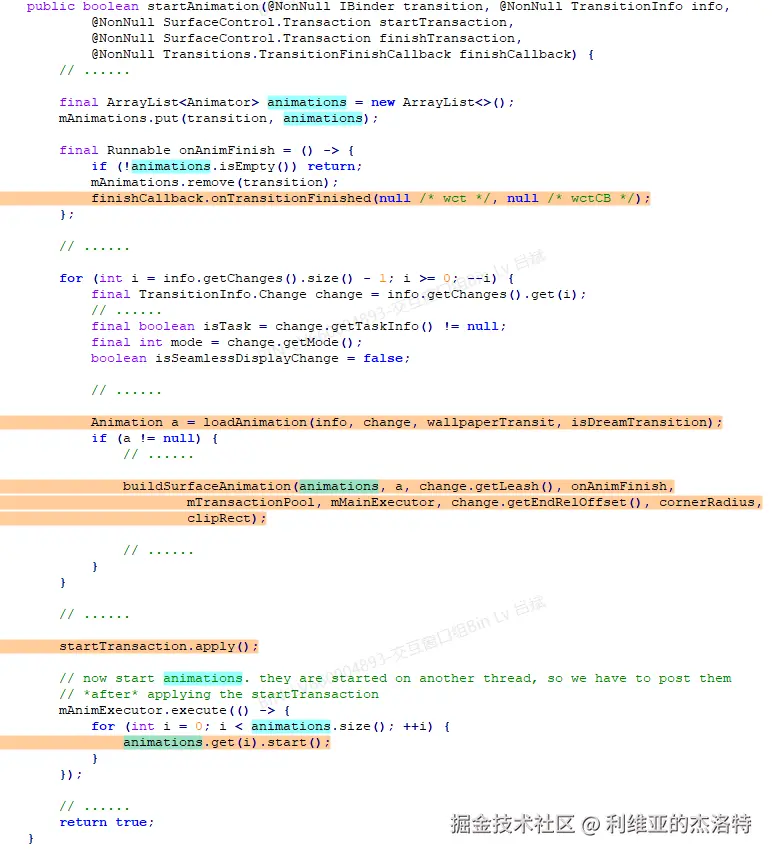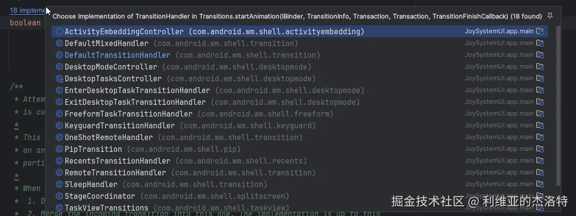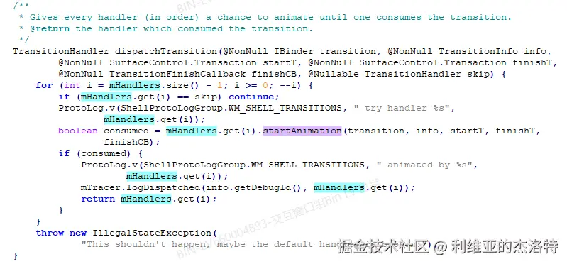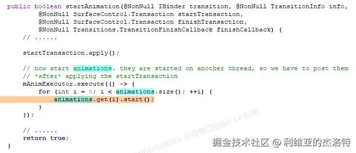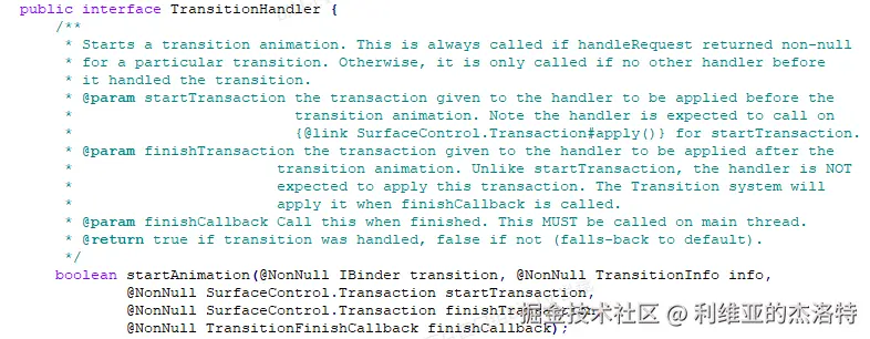 翻译一下注释:startAnimation用来启动一个过渡动画。对于某一个特定的Transition,如果该TransitionHandler的handleRequset方法返回一个non-null的值的话,那么该TransitionHandler的startAnimation将总是会被调用。否则,只有当排在该TransitionHandler之前的其它TransitionHandler都没有办法处理Transition的时候,该TransitionHandler的startAnimation才会被调用。