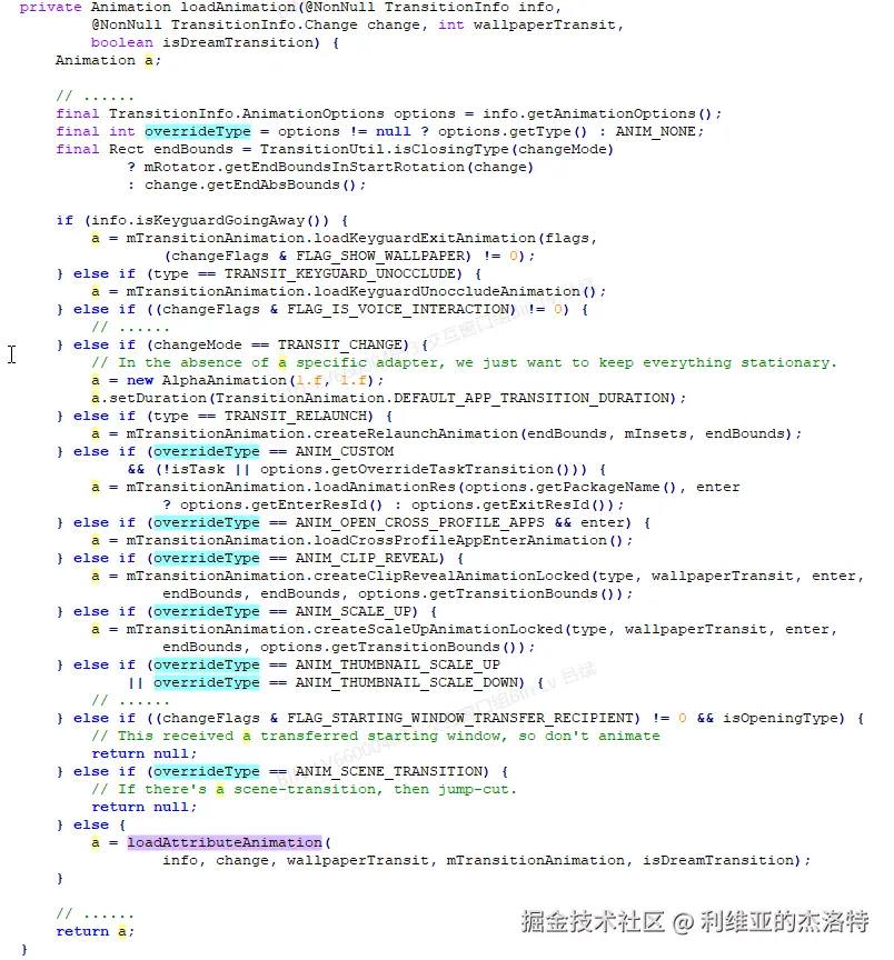 如果对之前AppTransition和AppTransitionController中的动画逻辑有印象的话,那么看到这里应该会很熟悉,这里差不多就是AppTransition.loadAnimation,主要就是根据动画的类型,以及是否有自定义动画来选择动画的样式。
