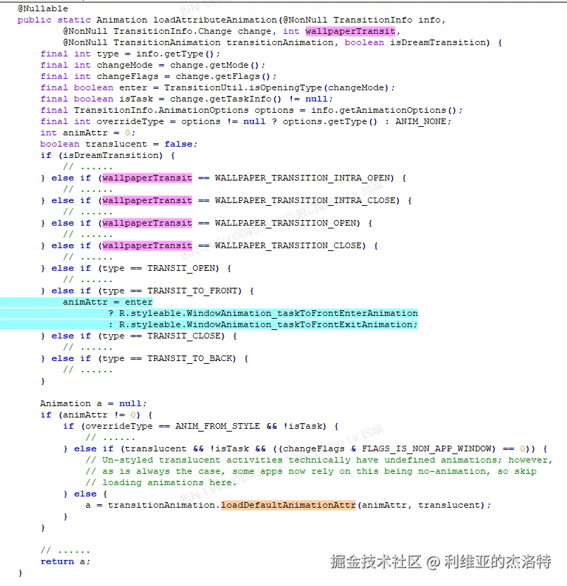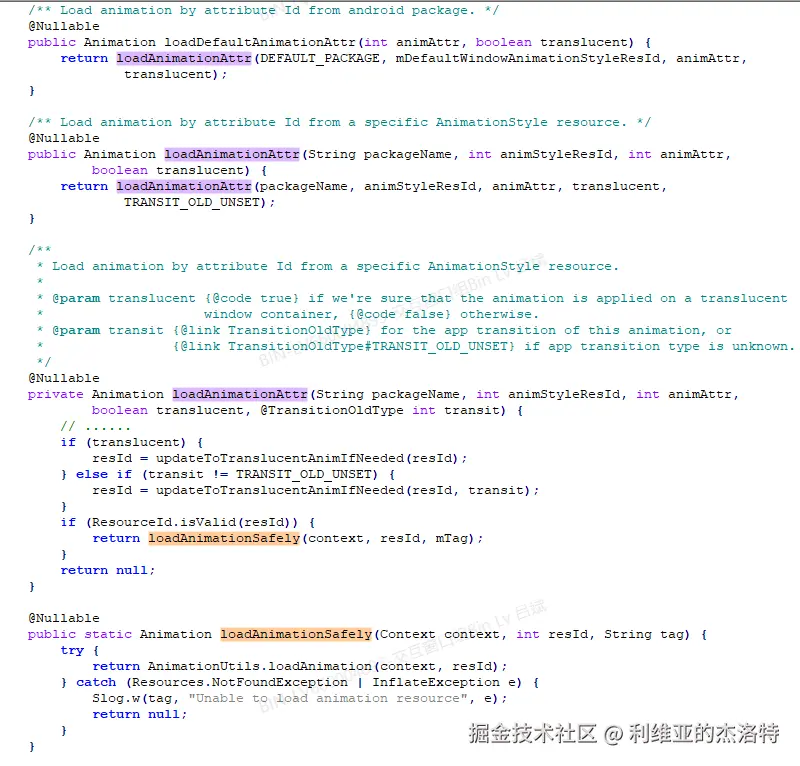 最后要注意我们这里拿到的只是一个资源ID,最终还是要通过TransitionAnimation.loadDefaultAnimationAttr来将这个资源ID转化为Animation对象,大概过一下: