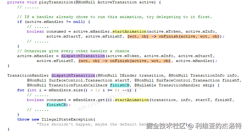 设置一个Runnable,该Runnable将在动画结束的时候执行(后续分析会看到,这里先提一嘴),执行的则又是传参finishCallback的onTransitionFinished方法,再看我们分析的流程下,TransitionHandler.startAnimation方法被调用的两处地方,分别在Transitions.playTransition和Transitions.dispatchTransition,得知: