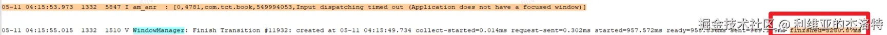 比如在我们分析的Launcher启动Messag场景中,”start transaction“中包含着对Message的Surface进行Transaction.show的设置,”start transaction“被延迟应用就意味着Message的Surface被延迟显示,如果超过5s还没应用,那么就有可能会引发无焦点窗口的ANR(在上层WMS窗口焦点已经切换到Message,但是在SF层Message的Layer由于没有显示因此在InputDispatcher侧无法作为焦点窗口),这种情况下一般还会伴随着以下log: