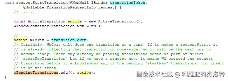 WMShell侧根据从WMCore侧传来的Transition对象的token,创建了一个与Transition对象一一对应的ActiveTransition对象,并且将这个传过来的token保存到了ActiveTransition.mToken中,然后将这个ActiveTransition对象保存到了Transitions.mPendingTransitions中。