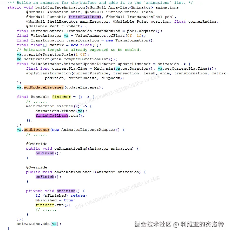 1)、调用ValueAnimator.addUpdateListener为这个ValueAnimator添加一个监听每一帧进行更新的ValueAnimator.AnimatorUpdateListener,在每一帧到来的时候,调用DefaultTransitionHandler.applyTransformation来对leash进行更新。