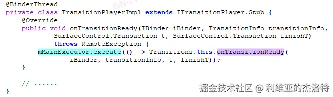 TransitionPlayerImpl是ITransitionPlayer的本地实现,这里继续调用了Transitions.onTransitionReady方法,但要注意的是,这里并不是直接调用了Transitions.onTransitionReady,而是将这个调用操作放到了主线程中执行,那么这里多多少少会有一些延迟,更甚者,如果SystemUI主线程在做耗时操作,那么就会更晚走到Transitions.onTransitionReady,这影响的是这里的传参,Transaction类型的“t”,即之前的文章所提到的“start transaction”的apply的时间,严重点就会引发ANR,关于这一点当我们分析到“start transaction”被apply的时候再聊聊。