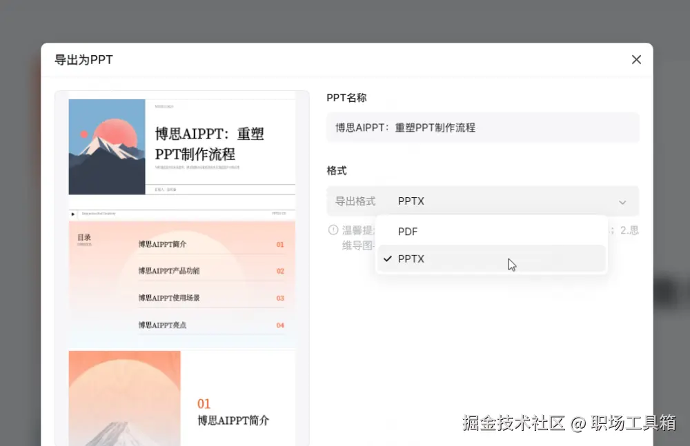 当PPT制作完成后,你可以将其下载到本地。用鼠标选中所有的幻灯片页面,点击博思AIPPT右上角的 “导出”按钮,选择 PPT,就能将存储在云端的幻灯片导出为一份PPT文件。