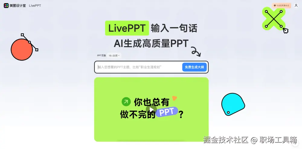 美图设计室 LivePPT 提供大量创意元素,用户可以根据自己的需求进行选择和组合,打造个性化的 PPT。它支持多种格式导出,方便用户在不同场合进行展示和分享。