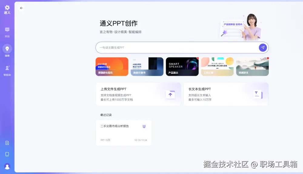 通义千问PPT拥有海量PPT模版,能够满足不同场景的需求。同时,它的文案智能识别功能可以准确理解用户的需求,生成更符合用户要求的 PPT。通义千问PPT还具有智能排版功能,可在线实时调整PPT模板编排、配图智能生成、文本智能改写等,操作简单,能够提升工作学习效率。
