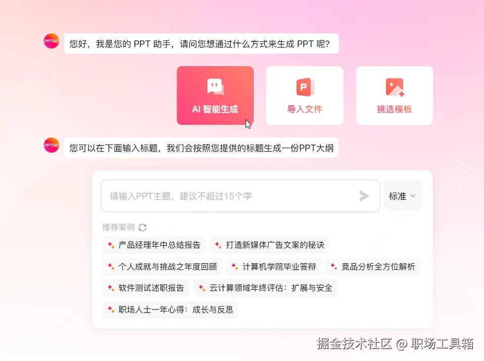 导入文件生成 PPT:支持导入 Word、PDF、Markdown、TXT、Xmind 等文件,经 AI 提炼生成大纲,再生成 PPT。